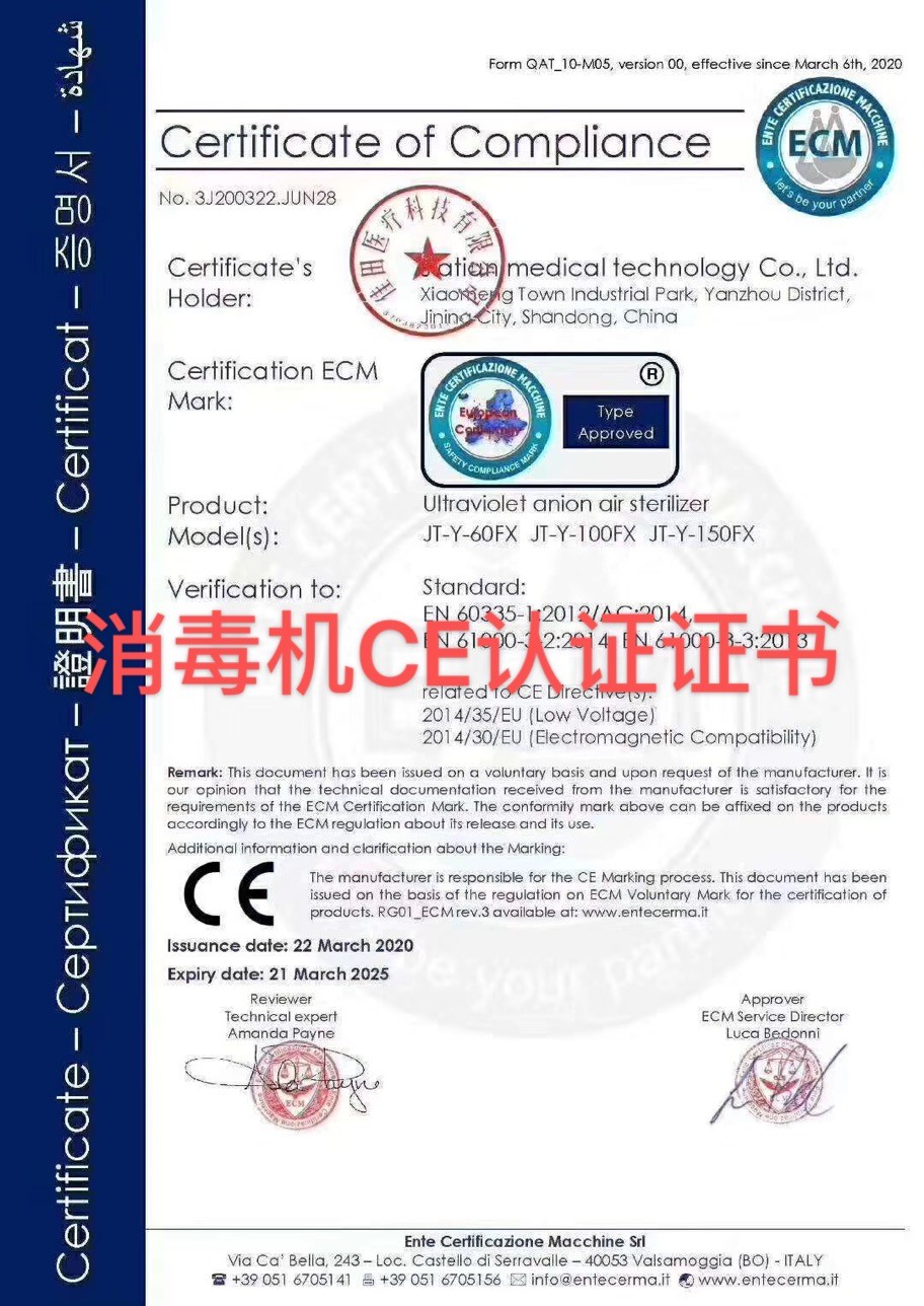 佳田醫(yī)療科技紫外線負(fù)離子消毒機取得了CE證書,可出口歐盟國家中國網(wǎng)2月5日訊國家......
